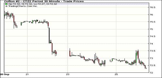 9月25日,紐約期棉連續(xù)第四個(gè)交易日收低,近期10月合約結(jié)算價(jià)70.81美分/磅,跌20點(diǎn);主力12月合約結(jié)算價(jià)72.33美分/磅,跌17點(diǎn)。當(dāng)日市場缺乏方向指引,主力12月合約早盤在72.80美分/磅上下震蕩;午盤后一波買盤逢低入市對期棉形成支持,該合約至當(dāng)日最高點(diǎn)73.59美分/磅;后買盤獲利平倉回吐全部漲幅,該合約盤終收于8月14日以來最低點(diǎn)。當(dāng)日外部商品市場除大豆反彈收高外,其他商品繼續(xù)走低。