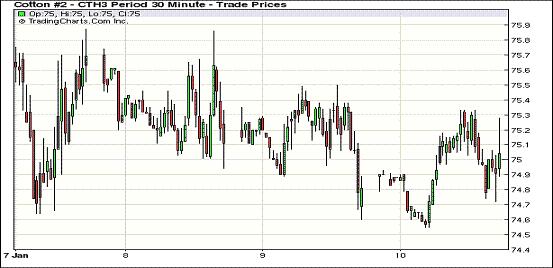 1月10日,紐約期棉受美棉出口增加和裝運(yùn)進(jìn)度有所加快影響全面收漲,近期3月合約結(jié)算價75.20美分/磅,漲41點(diǎn),1305月合約76.04美分,漲37點(diǎn)。當(dāng)日3月合約早盤圍繞前一日低點(diǎn)波動,交易中期和后期繼續(xù)在75美分處尋求支撐,美棉出口周報利好,市場表現(xiàn)穩(wěn)定,3月合約終收于近高點(diǎn)。 據(jù)美國農(nóng)業(yè)部(USDA),12.28-1.3一周美國凈簽約出口本年度陸地棉44566噸,較前一周增9%,裝運(yùn)58219噸,較前一周增41%。