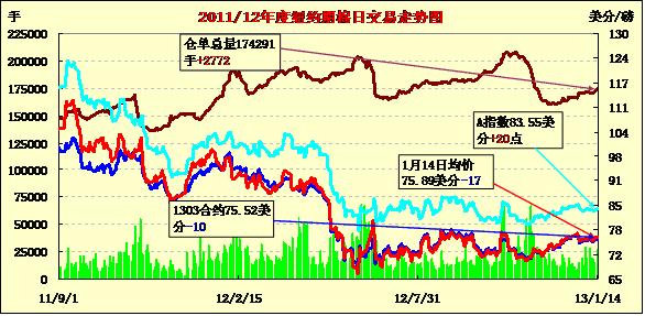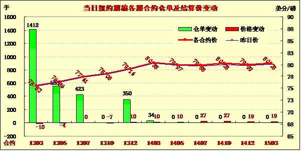 1月14日,紐約期棉缺乏方向指引呈盤整格局,主力1303月合約結(jié)算價75.52美分/磅,跌10點;1305月合約結(jié)算價76.36美分/磅,跌4點。成交量較上周五有所下滑。當(dāng)日市場平穩(wěn)開盤,早盤短暫走高后受賣盤打壓回落,主力合約在午盤前后至當(dāng)日最低點75.12美分/磅;后在外圍谷物商品走高提振下反彈,尾盤時分賣盤再次入市打壓該合約回落,盤終微幅收跌。當(dāng)日外部谷物及原油市場普遍收漲。
