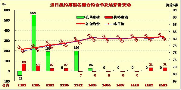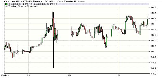 1月15日,紐約期棉漲跌互現(xiàn),主力1303月合約收于76.21美分/磅,漲69點(diǎn);1305月合約結(jié)算價(jià)76.84美分/磅,漲48點(diǎn);其他遠(yuǎn)期合約小幅收漲或微幅收跌。棉花基本面持續(xù)低迷,下年度植棉面積縮減及澳大利亞持續(xù)高溫或?qū)π禄ㄔ斐蓳p害對(duì)期棉形成支持。當(dāng)日市場(chǎng)平穩(wěn)開盤,主力合約早盤上行至當(dāng)日最高點(diǎn)76.30美分/磅,未能觸及上周五的高點(diǎn)76.44美分;后賣盤涌入打壓市場(chǎng)回落,尾盤時(shí)分又在谷物市場(chǎng)走高支持下反彈,盤終該合約收于12月26日以來最高值。當(dāng)日外部玉米及小麥?zhǔn)袌?chǎng)收漲,大豆及原油市場(chǎng)走低。