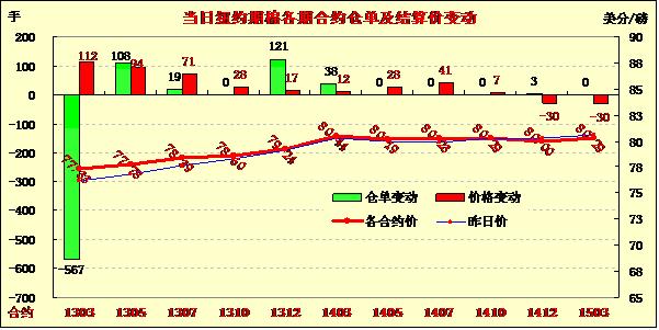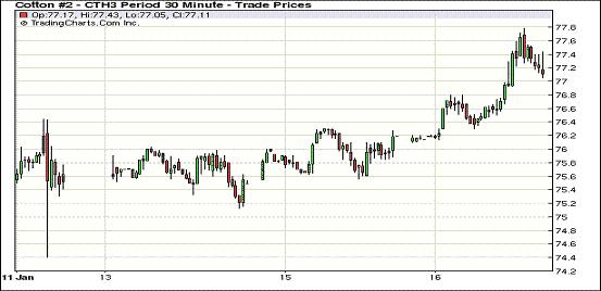 1月16日,紐約期棉多數(shù)合約大幅上揚,主力1303月合約收于77.33美分/磅,為8月31日以來最高點,漲112點;1305月合約結算價77.78美分/磅,漲91點。市場成交量較前幾日明顯增多。當日市場平穩(wěn)開盤,主力合約早盤在76.60美分一線波動,后投機買盤入市及外部商品市場走高促期棉一路上揚,該合約突破近期的震蕩區(qū)間74-77美分/磅,當日最高至77.78美分/磅,尾盤雖略有回落但仍漲幅過百,收于8月31日以來最高值。當日外部谷物及原油商品市場也普遍收漲。市場傳言中國紡企對國儲投放的儲備棉質(zhì)量不滿意,可能會轉而采購質(zhì)量較高的美棉, 這對期棉市場形成支持;此外,美國國家棉花總會(NCC)植棉意向調(diào)查顯示,美國2013年植棉植棉可能降至98年以來最低點,這也支持市場走高。
