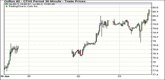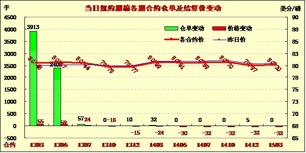 1月23日,受美棉庫(kù)存持續(xù)減少及市場(chǎng)需求良好支持,紐約期棉前三份合約繼續(xù)收漲,主力1303月合約收于80.48美分/磅,漲55點(diǎn);1305月合約結(jié)算價(jià)80.67美分/磅,漲59點(diǎn);1307月合約結(jié)算價(jià)80.44美分/磅,漲24點(diǎn);其他遠(yuǎn)期合約整體小幅收跌。當(dāng)日市場(chǎng)平穩(wěn)開盤,主力合約早盤在79.80美分/磅一線震蕩,后受外圍商品市場(chǎng)普遍走低拖累下行,當(dāng)日最低至78.94美分/磅;下半場(chǎng)投機(jī)買盤入市促市場(chǎng)反彈,該合約再次突破80美分,當(dāng)日最高至80.51美分/磅,震蕩幅度257點(diǎn),盤終收于2012年5月10日以來最高。近兩個(gè)月美棉出口情況持續(xù)良好,庫(kù)存不斷減少;市場(chǎng)傳言中國(guó)紡企對(duì)投放的儲(chǔ)備棉質(zhì)量不滿,傾向于采購(gòu)質(zhì)量較好的美棉,這些因素對(duì)ICE期棉近期合約形成支持。因本周一美盤休市一天,新一期美棉出口周報(bào)推遲至周五發(fā)布。