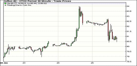 1月25日,紐約期棉近期合約一改近期的強(qiáng)勢上揚勢頭大幅收跌,主力1303月合約80.52美分/磅,減237點;1305月合約結(jié)算價80.48美分/磅,減172點;1307月合約收于80.40美分/磅,減64點;其他遠(yuǎn)期合約微幅盤整。市場嚴(yán)重超買及美棉簽約量下降是打壓近期合約大跌的主要原因。當(dāng)日市場中幅低開,主力合約早盤主要在82-82.5美分之間窄幅震蕩,因該合約在過去10個交易日中持續(xù)上揚,市場處于嚴(yán)重超買狀態(tài),下半場買家獲利平倉打壓市場大幅走低,該合約盤中收跌200余點,但本周累計漲197點,漲幅2.5%;1305月合約累計漲181點;1307月合約累計漲140點。