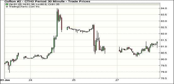 1月25日,紐約期棉近期合約一改近期的強(qiáng)勢(shì)上揚(yáng)勢(shì)頭大幅收跌,主力1303月合約80.52美分/磅,減237點(diǎn);1305月合約結(jié)算價(jià)80.48美分/磅,減172點(diǎn);1307月合約收于80.40美分/磅,減64點(diǎn);其他遠(yuǎn)期合約微幅盤整。市場(chǎng)嚴(yán)重超買及美棉簽約量下降是打壓近期合約大跌的主要原因。當(dāng)日市場(chǎng)中幅低開(kāi),主力合約早盤主要在82-82.5美分之間窄幅震蕩,因該合約在過(guò)去10個(gè)交易日中持續(xù)上揚(yáng),市場(chǎng)處于嚴(yán)重超買狀態(tài),下半場(chǎng)買家獲利平倉(cāng)打壓市場(chǎng)大幅走低,該合約盤中收跌200余點(diǎn),但本周累計(jì)漲197點(diǎn),漲幅2.5%;1305月合約累計(jì)漲181點(diǎn);1307月合約累計(jì)漲140點(diǎn)。