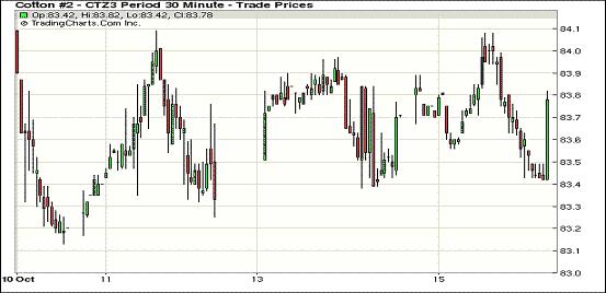 10月15日,在逢低買盤支持下,紐約期棉連續(xù)第三個交易日上揚,主力12月合約結(jié)算價83.71美分/磅,漲10點;1403月合約收于84.69美分/磅,漲13點。市場成交量較前一日有所上揚。當日市場平穩(wěn)開盤后短暫走低,后在一波買盤支持下反彈至當日高點84.08美分/磅;美元走高打壓商品市場普遍走軟,期棉承壓回落并在下半場持續(xù)走低,尾盤時分逢低買盤入市促市場反彈上揚,各合約盤終普遍收漲。1403月合約較1312月價差擴大到98點,較前一日增3點。