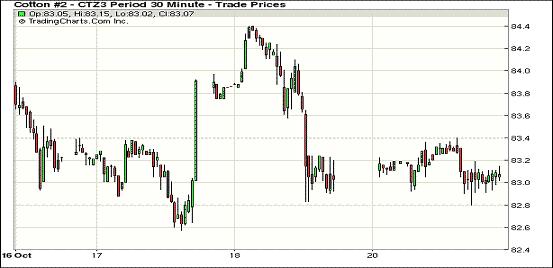 10月21日,受登記庫存增加打壓,紐約期棉連續(xù)第二個(gè)交易日收跌,主力12月合約結(jié)算價(jià)83.06美分/磅,跌5點(diǎn);1403月合約收于84.25美分/磅,跌7點(diǎn)。當(dāng)日市場(chǎng)平穩(wěn)開盤,主力12月合約早盤在83.2-83.3美分/磅之間窄幅震蕩,午盤后震蕩區(qū)間下行至83美分,受供應(yīng)增加影響,該合約盤終收于9月5日以來最低點(diǎn)。當(dāng)日大豆及玉米期貨走高,小麥及原油市場(chǎng)收跌。