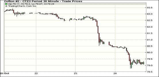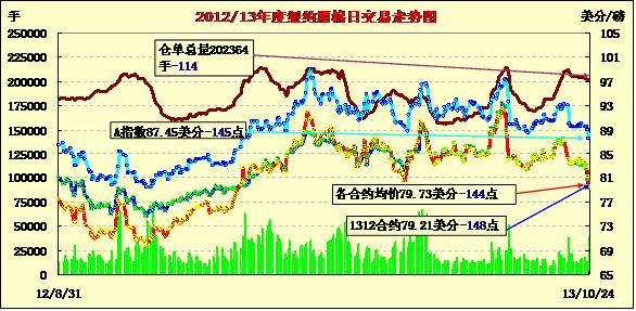 10月24日,受基金及投機(jī)資金多頭撤出、市場對供需產(chǎn)生憂慮等因素打壓,紐約期棉連續(xù)第五個(gè)交易日收跌,主力12月合約結(jié)算價(jià)79.21美分/磅,跌148點(diǎn);1403月合約收于80.80美分/磅,跌147點(diǎn);其他遠(yuǎn)期合約跌幅84-142點(diǎn)不等。市場交易持續(xù)活躍。