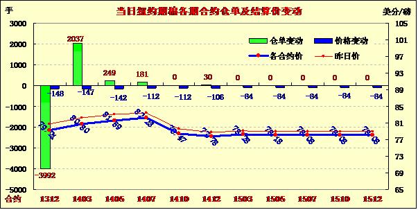 當(dāng)日市場平開低走,主力12月合約早盤在80-80.5美分/磅窄幅震蕩,后USDA銷售數(shù)據(jù)低迷打壓市場下行,該合約跌破80美分阻力位,此時(shí)并未有買盤逢低買入,基金及投資人資金多頭賣出打壓市場繼續(xù)下行跌破79美分,當(dāng)日最低至78.76美分/磅,盤終該合約收于今年1月18日以來最低值。3月合約較12月合約升水走寬至159點(diǎn),較前一日增1點(diǎn)。