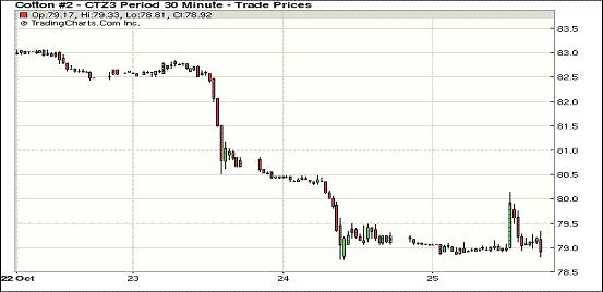 10月25日,在棉花市場(chǎng)供應(yīng)壓力及需求憂(yōu)慮影響下,紐約期棉連續(xù)第六個(gè)交易日收跌,主力12月合約結(jié)算價(jià)79.08美分/磅,跌13點(diǎn);遠(yuǎn)期3月合約收于80.59美分/磅,跌21點(diǎn)。