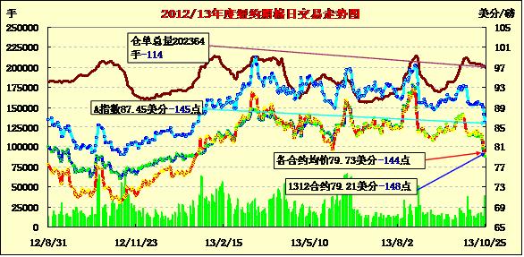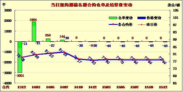 市場(chǎng)成交量較前兩日縮小。當(dāng)日市場(chǎng)平穩(wěn)開(kāi)盤(pán),早盤(pán)在79美分/磅上下窄幅震蕩,午盤(pán)后買(mǎi)盤(pán)入市促市場(chǎng)上揚(yáng),主力合約至當(dāng)日最高點(diǎn)80.14美分,后供需憂(yōu)慮打壓市場(chǎng)回落,盤(pán)終該合約收于今年1月15日以來(lái)最低值。12月合約較3月合約跌水較前一日減8點(diǎn),為151點(diǎn)。本周12月合約累計(jì)跌403點(diǎn),跌幅4.8%;1403月合約累計(jì)跌363點(diǎn)。