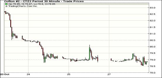 10月28日,因北半球新花上市逐步增加,季節(jié)性壓力打壓紐約期棉連續(xù)第七個(gè)交易日收跌,主力12月合約結(jié)算價(jià)78.65美分/磅,跌43點(diǎn);1403月合約收于80.45美分/磅,跌14點(diǎn);其他遠(yuǎn)期合約跌幅15-19點(diǎn)不等。當(dāng)日期棉平穩(wěn)開(kāi)盤(pán),早盤(pán)在買(mǎi)盤(pán)支持下上漲,主力12月合約至當(dāng)日最高點(diǎn)79.49美分/磅(+41點(diǎn)),后新花上市壓力打壓市場(chǎng)回落,該合約再創(chuàng)新低,盤(pán)終收于今年1月來(lái)最低值。3月合約較12月合約升水走寬至180點(diǎn),較前一日增21點(diǎn)。