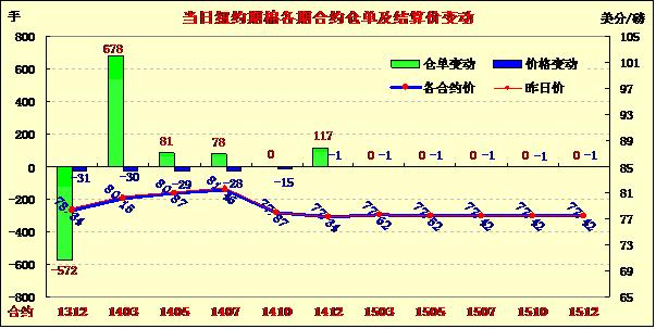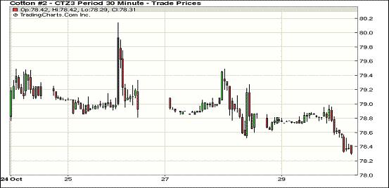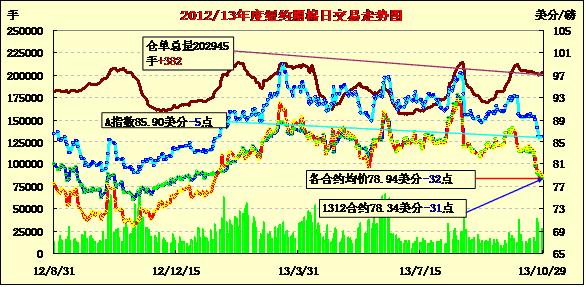 10月29日,在北半球新花上市量增加的壓力下,紐約期棉連續(xù)第八個(gè)交易日收跌,錄得五月來(lái)最長(zhǎng)跌勢(shì)。主力12月合約結(jié)算價(jià)78.34美分/磅,跌31點(diǎn);1403月合約收于80.15美分/磅,跌30點(diǎn)。當(dāng)日期棉微幅高開(kāi),主力12月合約上半場(chǎng)圍繞78.8美分/磅上下震蕩;新花上市增加壓力繼續(xù)對(duì)市場(chǎng)形成壓力,市場(chǎng)在午盤(pán)后持續(xù)下行,該合約當(dāng)日最低至78.29美分/磅,盤(pán)終雖略有回調(diào),仍收于2012年12月28日(78.11美分/磅)以來(lái)最低值。當(dāng)日外部股市及谷物市場(chǎng)收高。交易商認(rèn)為,78美分水平是下一波技術(shù)性拋售的觸發(fā)位,可能使12月合約跌至去年11月以來(lái)最低75.5美分。貿(mào)易商關(guān)注本周召開(kāi)的中儲(chǔ)棉會(huì)議。