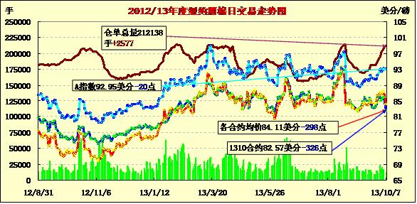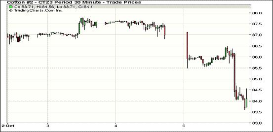 10月7日,因市場對美國棉區(qū)受熱帶風(fēng)暴損害的擔(dān)憂緩解,紐約期棉全面大跌,近期10月合約結(jié)算價82.57美分/磅,跌326點;主力12月合約結(jié)算價84.02美分/磅,跌316點;遠(yuǎn)期3月合約收于84.45美分/磅,跌268點;其他遠(yuǎn)期合約跌幅197-267點不等。
