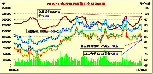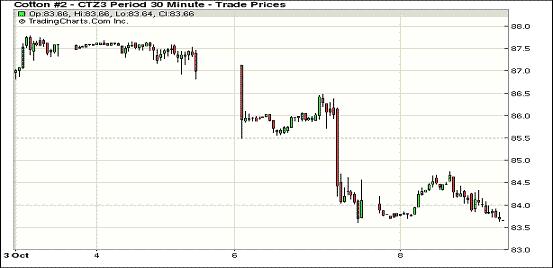 10月8日,紐約期棉延續(xù)前一日的跌勢(shì)繼續(xù)走低,近期10月合約結(jié)算價(jià)82.19美分/磅,跌38點(diǎn);主力12月合約結(jié)算價(jià)83.69美分/磅,跌33點(diǎn);遠(yuǎn)期3月合約收于84.15美分/磅,跌30點(diǎn)。當(dāng)日市場(chǎng)平穩(wěn)開盤,主力12月合約早盤在買盤推動(dòng)下上行至當(dāng)日高點(diǎn)84.75美分/磅,下半場(chǎng)受市場(chǎng)對(duì)天氣擔(dān)憂減弱及美國聯(lián)邦政府停運(yùn)等因素影響持續(xù)走低,盤終小幅收跌。12/3月合約價(jià)差46點(diǎn)。當(dāng)日外部谷物市場(chǎng)也普遍走低。分析指出,美國熱帶風(fēng)暴減弱,并未對(duì)棉區(qū)造成損害;美政府停運(yùn)進(jìn)入第二周,投資者保持警惕;同時(shí)圍繞聯(lián)邦債務(wù)撞線和國債違約的擔(dān)憂打壓股市及外部商品市場(chǎng)普遍走低,期棉在上述因素影響下維持跌勢(shì)。