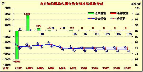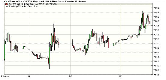 11月12日紐約期棉近期12月及主力3月合約上漲,其余遠(yuǎn)期合約均不同程度下跌。近期12月合約收于77.88美分/磅,漲91點(diǎn);主力3月合約結(jié)算價(jià)78.22美分/磅,漲2點(diǎn);1405月合約收于78.79美分/磅,跌10點(diǎn)。當(dāng)日期棉早盤高開高走,近期12月合約上漲近100點(diǎn),最高漲至78.44美分/磅,當(dāng)日震蕩區(qū)間156點(diǎn),主力3月合約盤終微漲,市場(chǎng)交投活躍。