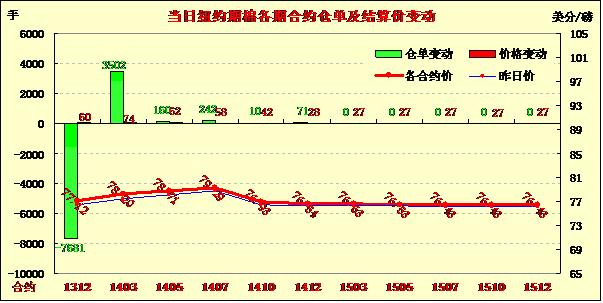 11月15日,受上周美棉出口簽約出口利好支持,紐約期棉全面反彈。近期12月合約結(jié)算價(jià)77.12美分/磅,漲60點(diǎn);主力3月合約收于78.20美分/磅,漲74點(diǎn)。當(dāng)日期棉略有低開,主力3月合約午盤前后跌至當(dāng)日最低點(diǎn)76.52美分/磅,后受美棉出口數(shù)據(jù)利好支持反彈并收漲。該合約在繼前一日跌至近12個(gè)月低點(diǎn)之后,當(dāng)日重回78美分之上,較近期12月合約升水108點(diǎn),較前一日增14點(diǎn)。據(jù)美國(guó)農(nóng)業(yè)部(USDA),11.1-11.7一周美國(guó)凈簽約出口本年度陸地棉107207噸,為2012年6月份以來最高周度數(shù)據(jù),這促使美棉全面反彈,然而市場(chǎng)新花供應(yīng)增加、期末庫存巨大及中國(guó)拋儲(chǔ)壓力限制期棉漲幅。