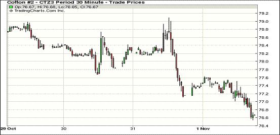 11月1日,紐約期棉連續(xù)第11個(gè)交易日下跌;主力12月合約結(jié)算價(jià)76.58美分/磅,跌60點(diǎn);1403月合約收于78.70美分/磅,跌50點(diǎn)。當(dāng)日期棉早盤(pán)波動(dòng)不大,主力12月合約先漲后跌,盤(pán)終跌60點(diǎn),該合約已連續(xù)四周下跌,自十月份達(dá)到高點(diǎn)后累計(jì)跌幅12.8%,逼近一年來(lái)低位;市場(chǎng)成交量放大,因美元指數(shù)持續(xù)上漲,外部谷物市場(chǎng)多下跌。本周期棉仍持續(xù)下滑,預(yù)計(jì)將創(chuàng)最長(zhǎng)下跌紀(jì)錄;全球棉花供應(yīng)量上升,棉價(jià)上漲支撐有限;強(qiáng)降雨影響中南棉區(qū)三角洲棉花采摘。