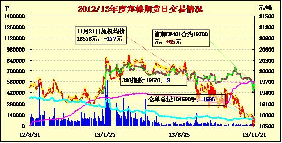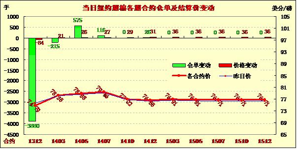 11月21日,紐約期棉延續(xù)前一日走勢,近期12月合約下跌,其余合約上漲;主力12月合約結(jié)算價(jià)74.79美分/磅,跌84點(diǎn);1403月合約收于78.35美分/磅,漲21點(diǎn);1405月合約收于78.88美分/磅,漲26點(diǎn)。由于市場賣盤,期棉開盤后除近期12月合約小幅下跌外,遠(yuǎn)期合約均上漲,主力3月合約在78美分之上震蕩運(yùn)行,3月較12月合約升繼續(xù)走寬至356點(diǎn)。盡管美棉出口簽約量低于上周,21日期棉仍上漲,全球高庫存持續(xù)令棉價(jià)承壓。