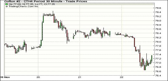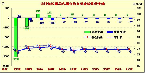 11月22日,基本面偏空及中國棉花進(jìn)口量同比大減打壓紐約期棉除近期12月合約外普遍回落,12月合約結(jié)算價75.21美分/磅,漲42點;主力1403月合約收于77.23美分/磅,跌112點;其他遠(yuǎn)期合約跌幅67-125點不等。當(dāng)日主力合約平穩(wěn)開盤,早盤在78.2-78.4美分一線窄幅震蕩,因基本面全球庫存持續(xù)上升及中國10月份進(jìn)口量同比大減38.8%對市場形成壓力,期棉受打壓下行,該合約交易后半場在76.8-77美分之間波動,盤終跌幅超百點。當(dāng)周近期12月合約累計跌191點,1403月合約跌97點。