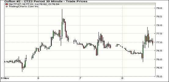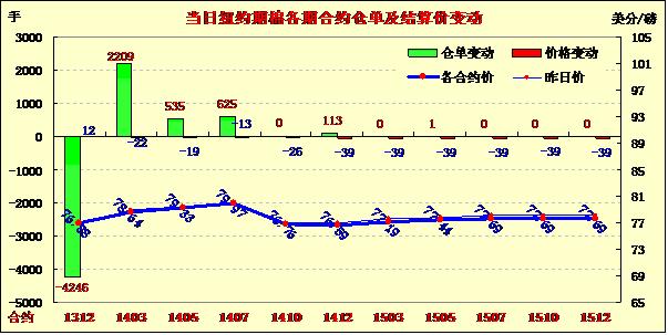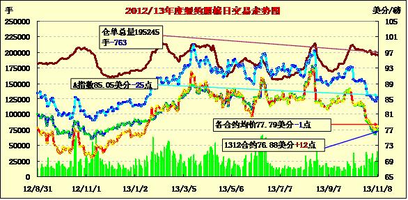11月8日,紐約期棉除12月合約上漲外,其余合約均普遍下跌;主力12月合約結(jié)算價76.88美分/磅,漲12點;1403月合約收于78.64美分/磅,跌22點。當日12月合約早盤略有上漲,最高漲至77.88美分,最低75.85美分,盤終略微收漲;3月取代成為12月成為主力合約,盤終下跌22點,3月較12月合約升水176點,較周四的210點拉窄,市場成交量放大。