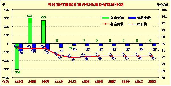 12月23日,由于市場(chǎng)缺乏足夠利好支撐,期棉普遍下跌;主力3月合約結(jié)算價(jià)82.24美分/磅,跌91點(diǎn);1405月合約收于82.14美分/磅,跌77點(diǎn);1405月合約收于82.18美分/磅,跌71點(diǎn)。當(dāng)日期棉早盤整體下跌,主力3月合約跌幅較大,午盤后買盤增多雖略有反彈,但盤終仍收跌91點(diǎn),外部谷物市場(chǎng)同樣普遍下跌;假日因素制約市場(chǎng)成交。
