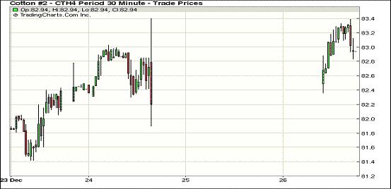 12月26日,紐約期棉近跌遠(yuǎn)漲,主力3月合約結(jié)算價82.89美分/磅,跌29點(diǎn);5月合約結(jié)算價82.62美分/磅,跌19點(diǎn)。受節(jié)日氣氛影響,市場成交極為清淡,成交量僅5000余手。在25日休市一天之后,26日期棉市場延續(xù)24日漲勢小幅高開,主力3月合約大部分時段在83-83.4美分之間震蕩,尾盤時分外部谷物商品市場走低對期棉形成壓力,該合約回落并以陰跌收盤。多數(shù)貿(mào)易商在節(jié)日期間離場,導(dǎo)致市場成交清淡。分析指出,受圣誕節(jié)假期影響,美棉出口周報推遲至本周五晚公布,市場預(yù)期上周出口量下降。