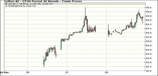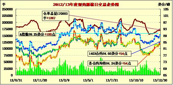 12月30日,在技術(shù)買盤及市場(chǎng)預(yù)期美棉供應(yīng)偏緊的支持下,紐約期棉延續(xù)上周五漲勢(shì)繼續(xù)上揚(yáng),主力3月合約結(jié)算價(jià)84.66美分/磅,漲54點(diǎn);5月合約結(jié)算價(jià)84.18美分/磅,漲48點(diǎn)。市場(chǎng)交投淡靜,成交量不足萬(wàn)手。當(dāng)日市場(chǎng)平開(kāi)高走,主力3月合約早盤在84美分短暫停留后一路上揚(yáng),下半場(chǎng)成功試探85美分阻力位,當(dāng)日最高至85.07美分/磅;尾盤回落回吐部分漲幅,盤終仍收于10月17日以來(lái)最高值。該合約在過(guò)去14個(gè)交易日中有10個(gè)交易日收高。當(dāng)日外部商品市場(chǎng)普遍收跌。分析指出,近期美棉銷售數(shù)據(jù)強(qiáng)勁,資源偏緊,同時(shí)下年度植棉意向不佳,市場(chǎng)擔(dān)心美棉資源供應(yīng)偏緊,這對(duì)期棉形成支持。