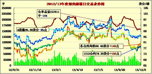 11月6日,紐約期棉各合約普遍上漲,近期合約漲幅均超百點(diǎn);主力12月合約結(jié)算價79.38美分/磅,漲156點(diǎn);1403月合約收于80.41美分/磅,漲156點(diǎn);1405月合約收于80.66美分/磅,漲142點(diǎn)。本周最后一個交易日,紐約期棉合約均大幅上漲,主力3月合約站上80美分,上漲156點(diǎn),為一個月來新高;受美國國內(nèi)就業(yè)率有利數(shù)據(jù)帶動,美股大漲,對期棉上漲形成支持。本周市場雖整體收漲,但基本面消息多為利空,預(yù)計圣誕節(jié)過后市場需求將減弱。