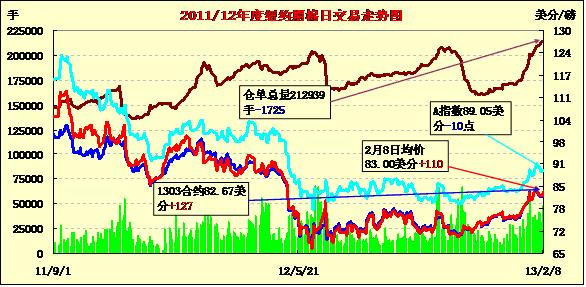 2月8日,受USDA(美國農(nóng)業(yè)部)全球供需報告調(diào)高美棉出口量刺激,紐約期棉全面收高,3月結(jié)算價82.67美分/磅,漲127點,12月合約結(jié)算價82.92美分,漲54點;成交量維持高位。市場穩(wěn)定開盤,早盤在81.5美分一線波動,盤中試探81美分壓力位獲得支撐反彈,因USDA報告中調(diào)高美棉本年度棉花出口量,以及全球期末庫存變化較小,交易后期市場反彈走高,在突破前幾日阻力的82美分以后收于近高點。全球期末庫存預期1782.3萬噸,調(diào)增3萬噸。USDA報告最新預期2012/13年度美棉出口量272.2萬噸,較上月調(diào)高6.6萬噸。中國進口量調(diào)增了32.6萬噸,至300萬噸以上。