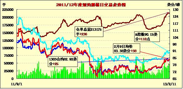 2月11日,紐約期棉市場不顧外部商品市場收跌,以全面上漲收盤,近期3月合約結(jié)算價82.92美分/磅,漲25點(diǎn),12月合約83.84美分,漲92點(diǎn);成交量大幅增加。當(dāng)日3月合約當(dāng)日交易先弱后強(qiáng)。該合約穩(wěn)定開盤后大幅上漲,早盤站上83美分以上,因指數(shù)基金平倉壓力高位下滑,后在82美分尋求支撐,交易后期受基本面NCC(美國國家棉花總會)預(yù)期美棉下年度面積下降支持反彈走高,最終以上漲收盤,3月合約因轉(zhuǎn)倉交易漲幅有限,遠(yuǎn)月合約漲幅過百點(diǎn)。