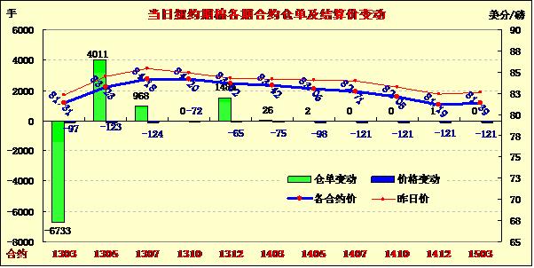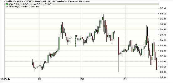 2月21日,在美元走強、外部商品市場整體走弱的影響下,紐約期棉結(jié)束四連漲局面全面收跌,近期3月合約收于81.31美分/磅,減97點;主力5月合約結(jié)算價83.23美分/磅,減123點(1.5%),為1月25日以來最大單日跌幅。當(dāng)日市場微幅低開,主力1305月合約早盤在83.6-84.2美分之間震蕩,較前一日震蕩區(qū)間下移;午盤后買盤涌入促市場短暫上揚,該合約當(dāng)日最高至84.77美分/磅,隨后外部市場走低打壓期棉回落,同時市場預(yù)計USDA(美國農(nóng)業(yè)部)將于周五晚公布的新一期美棉出口周報數(shù)據(jù)不佳也對期棉形成壓力,盤終主力合約大跌,其他合約也普遍跌幅較大。