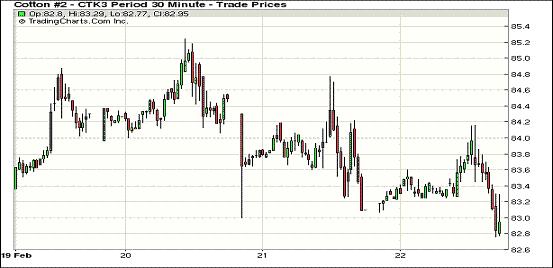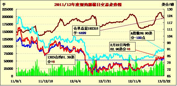 2月22日,紐約期棉多漲少跌,近期1303月合約81.39美分/磅,漲8點;主力1305月合約結(jié)算價83.14美分/磅,跌9點;1307月合約收于84.01美分/磅,跌17點;其他遠期合約微幅或小幅收漲。當(dāng)日市場早盤運行平穩(wěn),主力合約主要在83.2-83.6美分震蕩,后美棉出口裝運數(shù)據(jù)強勁促市場走高,該合約至當(dāng)日最高點84.16美分/磅,后外圍商品走低及賣盤涌入打壓市場回落,該合約盤中微幅收低。本周3月合約累計漲7點;5月合約累計跌5點;7月合約累計跌4點;12月合約累計漲39點。