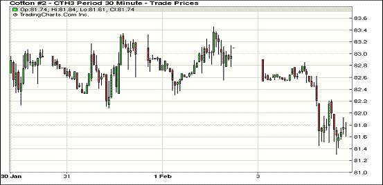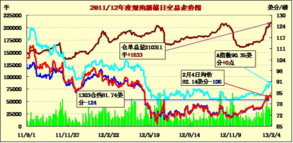 2月4日,紐約期棉前4份合約以下跌收盤,其他合約小幅收高,近期3月合約結算價81.74美分/磅,跌124點,1305月合約82.57美分,跌98點,技術性賣盤和美元上漲給予壓力。3月合約轉倉交易活躍,市場總成交維持高位狀態(tài)。當日3月合約平穩(wěn)開盤后因上攻83美分阻力位乏力,迫于技術面賣盤壓力盤中大幅下跌,前兩周市場以資金市為主,周一市場交易回歸基本面炒作,基本面上庫存壓力居高難下,加上美元上漲,對近期合約形成打壓,3月合約交易尾段在日低位徘徊,最終收于近低點。