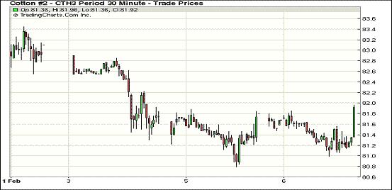 在多個報告發(fā)布前,市場觀望態(tài)度濃厚,2月6日紐約期棉近漲遠(yuǎn)跌,近期3月合約結(jié)算價81.72美分/磅,漲21點,1312月合約82.03美分,漲12點,2014年5月份以后合約小幅下跌。當(dāng)日3月合約小幅高開,早盤未能突破82美分壓力位掉頭向下,最低跌至80.99美分,后在81美分處獲得買盤支撐跌幅縮小,交易最后時段有多單介入,該合約收復(fù)跌幅以小漲收盤。本周四、周五和周六美國將有三個報告出爐,分別是美棉出口周報、全球棉花供需報告和NCC(美國國家棉花總會)面積意向報告,交易商在多個報告發(fā)布前調(diào)整頭寸。
