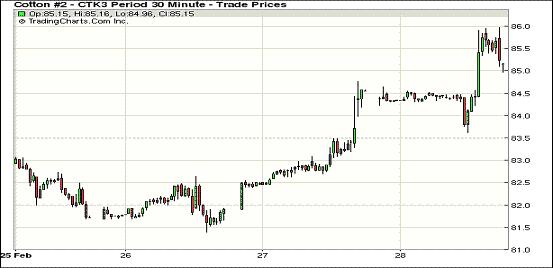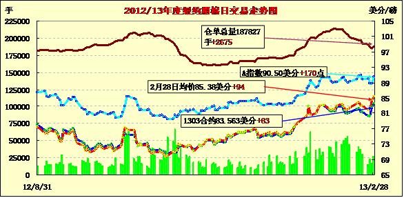 2月28日,新一期美棉出口裝運(yùn)數(shù)據(jù)強(qiáng)勁,同時(shí)外部谷物市場普遍走高,紐約期棉受支持繼續(xù)上揚(yáng),近期3月合約結(jié)算價(jià)83.56美分/磅,漲83點(diǎn);主力5月合約結(jié)算價(jià)85.29美分/磅,漲91點(diǎn)。市場成交量繼續(xù)增加。當(dāng)日市場平穩(wěn)開盤,主力5月合約早盤在84.4美分/磅一線運(yùn)行,后美棉出口數(shù)據(jù)良好促市場上揚(yáng),該合約當(dāng)日最高至85.97美分,盤終自2012年5月9日以來首次站于85美分之上。該合約2月份累計(jì)漲214點(diǎn),漲幅2.6%;3月合約累計(jì)漲61點(diǎn),漲幅0.74%。市場繼續(xù)猜測中國部分紡企或已經(jīng)收到進(jìn)口配額,中國下年度將繼續(xù)實(shí)施棉花收儲政策以支撐棉價(jià)。據(jù)美國農(nóng)業(yè)部(USDA),2.15-2.21一周美國凈簽約出口本年度陸地棉34677噸(較前一周減11%,但較近四周平均值增5%),裝運(yùn)95799噸(較前一周增8%,較近四周平均值增16%)。