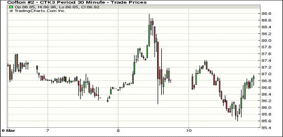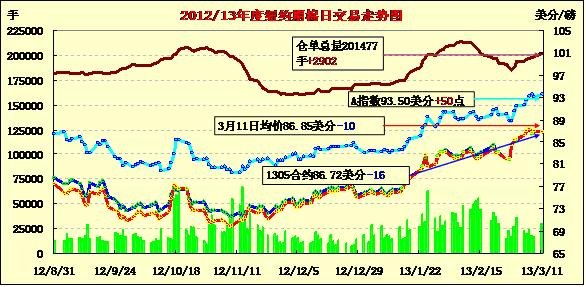 3月11日,拋開(kāi)美元下跌和外部商品市場(chǎng)上漲,紐約期棉市場(chǎng)多數(shù)合約下跌,近期5月合約結(jié)算價(jià)86.72美分/磅,跌16點(diǎn),12月合約86.68美分,漲29點(diǎn)。當(dāng)日5月合約小幅低開(kāi)后短暫停留在87美分水平,后受非商業(yè)性賣(mài)盤(pán)(投機(jī)賣(mài)盤(pán))打壓一路下行,盤(pán)中跌幅超過(guò)百點(diǎn),最低洞穿86美分,至85.59美分(-129點(diǎn))。交易后期因美元下跌和外部商品市場(chǎng)整體上揚(yáng),5月合約從低點(diǎn)反彈,最終收平于開(kāi)盤(pán)價(jià)一線。分析師指出,雖然USDA(美國(guó)農(nóng)業(yè)部)報(bào)告調(diào)低本年度全球期末庫(kù)存量,但總庫(kù)存仍處于高位,對(duì)市場(chǎng)形成壓力;而從技術(shù)上看,市場(chǎng)短期內(nèi)仍有望挑戰(zhàn)90美分。