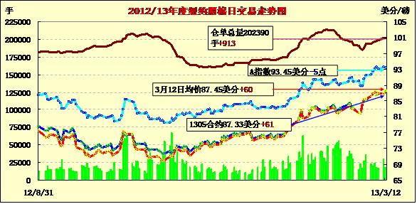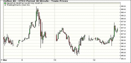 3月12日紐約期棉市場近強遠(yuǎn)弱,近期5月合約結(jié)算價87.33美分/磅,上漲61點,12月合約86.96美分,漲28點,2014年后各合約微幅下跌。5月合約平穩(wěn)開盤,早盤和盤中穩(wěn)定于前一日收盤水平,交易后期受非商業(yè)性買盤支持該合約反彈至87美分以上,并最終收于近高點。分析師指出,市場缺乏根本利好消息,市場走高主要得益于對下年度美棉產(chǎn)量或?qū)p少,出口和國內(nèi)消費預(yù)期增加的預(yù)期。