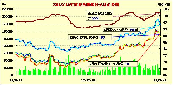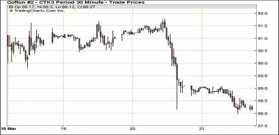 3月21日美棉出口減少及歐債危機(jī)擔(dān)憂對(duì)市場(chǎng)形成進(jìn)一步打壓,紐約期棉市場(chǎng)繼續(xù)走低,近期5月合約結(jié)算價(jià)88.20美分/磅,跌90點(diǎn),12月合約87.82美分,跌16點(diǎn)。當(dāng)日交易整體呈現(xiàn)下跌趨勢(shì),5月合約在89美分處開(kāi)盤(pán)后上半場(chǎng)交易在此水平線上微幅波動(dòng),交易中期下跌百余點(diǎn)在88美分獲得支撐后低位徘徊,最終收于近低點(diǎn)。盡管昨日公布的美國(guó)經(jīng)濟(jì)數(shù)據(jù)好于預(yù)期,但投資者更關(guān)注救援塞浦路斯局勢(shì)進(jìn)展;美棉出口周報(bào)顯示上周美棉出口減少,對(duì)市場(chǎng)形成利空。