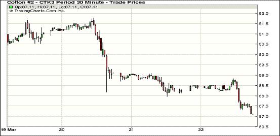 3月21日美棉出口減少及歐債危機(jī)擔(dān)憂對(duì)市場(chǎng)形成進(jìn)一步打壓,紐約期棉市場(chǎng)繼續(xù)走低,近期5月合約結(jié)算價(jià)88.20美分/磅,跌90點(diǎn),12月合約87.82美分,跌16點(diǎn)。當(dāng)日交易整體呈現(xiàn)下跌趨勢(shì),5月合約在89美分處開盤后上半場(chǎng)交易在此水平線上微幅波動(dòng),交易中期下跌百余點(diǎn)在88美分獲得支撐后低位徘徊,最終收于近低點(diǎn)。盡管昨日公布的美國經(jīng)濟(jì)數(shù)據(jù)好于預(yù)期,但投資者更關(guān)注救援塞浦路斯局勢(shì)進(jìn)展;美棉出口周報(bào)顯示上周美棉出口減少,對(duì)市場(chǎng)形成利空。