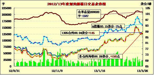 3月26日,受中國(guó)在2013年將繼續(xù)實(shí)施臨時(shí)收儲(chǔ)政策支持,紐約期棉強(qiáng)勢(shì)反彈,近期5月合約結(jié)算價(jià)88.04美分/磅,漲145點(diǎn);7月合約結(jié)算價(jià)89.33美分/磅,漲151點(diǎn);12月合約結(jié)算價(jià)87.23美分/磅,漲98點(diǎn)。在此之前的六個(gè)交易日中,紐約期棉有五個(gè)交易日收跌。昨日市場(chǎng)開(kāi)盤(pán)后一路上揚(yáng),主力5月合約當(dāng)日最高至88.88美分/磅,交易后段在88.5一線窄幅震蕩,尾盤(pán)時(shí)分買(mǎi)盤(pán)獲利平倉(cāng)回吐部分漲幅,盤(pán)終收漲百余點(diǎn)。其他合約也普遍大幅收漲。在昨天召開(kāi)的中國(guó)棉花協(xié)會(huì)二屆五次理事會(huì)上,國(guó)家發(fā)改委經(jīng)貿(mào)司副處長(zhǎng)李燕介紹,經(jīng)各部門(mén)會(huì)商、針對(duì)目前情況和一號(hào)文件要求,2013年將繼續(xù)實(shí)行敞開(kāi)收儲(chǔ)政策,以保持優(yōu)勢(shì)產(chǎn)棉區(qū)面積基本穩(wěn)定、穩(wěn)定市場(chǎng)預(yù)期和紡織需求,具體價(jià)格將在近期向社會(huì)公布,這一消息對(duì)棉市形成強(qiáng)勢(shì)支持。