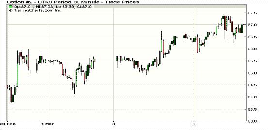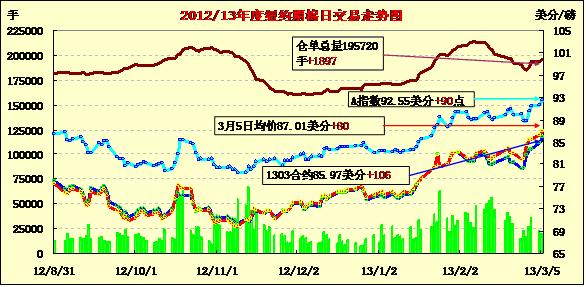 3月5日,紐約期棉前六份合約以繼續(xù)上漲收盤,其他合約小幅收跌,主力5月合約結(jié)算價86.98美分/磅,漲72點,12月合約85.74美分,漲32點。基本面上消息缺乏,投機買盤對近期合約形成支持。當日5月合約當日行情圍繞87美分上下波動,早盤穩(wěn)定于86美分水平,盤中受助于投機商空頭平倉上攻87美分關(guān)鍵阻力位成功,但交易后期因缺乏買盤跟進,87美分失守,最終略收低于該水平。分析師指出,技術(shù)面上如果5月合約能站穩(wěn)于87美分,下一步將向90美分發(fā)起挑戰(zhàn)。近期市場持倉量整體增加,有新的買盤介入,特別是商業(yè)買盤,但后期隨著投機商空頭平倉量增加,持倉量將出現(xiàn)減少勢頭。