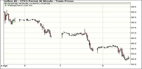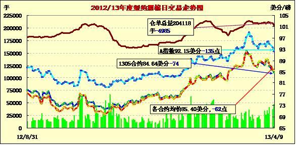 4月9日,紐約期棉連續(xù)第四個(gè)交易日收跌,近期5月合約結(jié)算價(jià)84.64美分/磅,跌74點(diǎn);7月合約結(jié)算價(jià)86.61美分/磅,跌65點(diǎn);12月合約結(jié)算價(jià)85.79美分/磅,跌2點(diǎn)。市場交易繼續(xù)活躍。當(dāng)日市場早盤運(yùn)行平穩(wěn),近期5月合約在85.5-86美分區(qū)間震蕩,后獲利了結(jié)賣盤入市打壓市場下行,該合約當(dāng)日最低至84.38美分,為3月1日以來最低點(diǎn)。由于展期及指數(shù)基金移倉交易活躍,7月合約自本周一以來成為主力合約。遠(yuǎn)期12月合約跌幅較小。