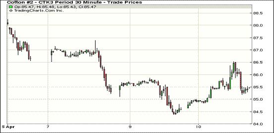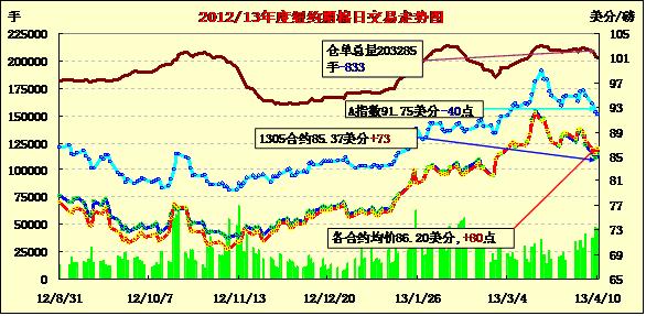 4月10日,USDA最新預測報告對市場影響有限,中國收儲政策公布對棉市形成提振,同時美國消息面利好支持股市及商品市場整體上揚,紐約期棉結束四連跌全面反彈,近期5月合約結算價85.37美分/磅,漲73點;主力7月合約結算價87.48美分/磅,漲87點;12月合約結算價86.57美分/磅,漲78點。市場交易持續(xù)活躍。當日市場平穩(wěn)開盤,近期5月合約早盤在買盤支持下上揚至85.8美分/磅左右,后中國收儲政策公布支持棉市走高,該合約當日最高至86.53美分/磅;交易后期買盤獲利平倉回吐部分漲幅,盤終中幅收漲。其他遠期合約漲幅62-87點不等。據USDA4月份月報,本年度全球棉花產量調低3.7萬噸,消費調高7萬噸,期末庫存調增45.2萬噸。經濟方面,美聯儲最新政策會議紀要強調繼續(xù)維持寬松貨幣政策以支持經濟,這對美國股市及商品市場也普遍構成提振。