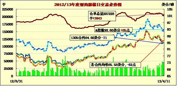 4月11日,最新一期美棉出口周報顯示中國以外地區(qū)需求減弱,同時技術(shù)性賣盤對市場形成壓力,紐約期棉經(jīng)歷短暫反彈后掉頭收跌,近期5月合約結(jié)算價84.66美分/磅,跌71點;主力7月合約結(jié)算價86.74美分/磅,跌74點;12月合約結(jié)算價85.66美分/磅,跌91點。市場成交量有所下降。當日期棉平穩(wěn)開盤,近期5月合約早盤在85.8-86美分一線震蕩,后美棉出口周報公布數(shù)據(jù)不佳打壓期棉走低。展期交易還未結(jié)束,技術(shù)性賣盤入市也是市場下跌的一個主要因素,盤終各合約跌幅64-95點不等。當日外部谷物商品市場普遍上揚,原油期貨收跌。據(jù)美國農(nóng)業(yè)部(USDA),3.29-4.4一周美國凈簽約出口陸地棉33362噸(較前一周及近四周平均值均減1%),裝運61643噸(較前一周減25%,較近四周平均值減18%);當周中國凈簽約本年度陸地棉22498噸,裝運24789噸;中國以外買家簽約量為10864噸。