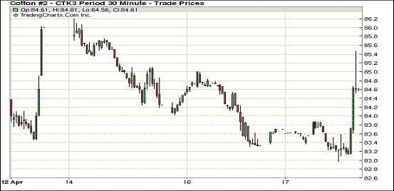 4月17日,紐約期棉結(jié)束前兩個交易日的跌勢低位反彈,近期5月合約結(jié)算價84.65美分/磅,漲130點;7月合約收于86.65美分/磅,漲123點;遠(yuǎn)期12月合約結(jié)算價85.87美分/磅,漲112點;其他遠(yuǎn)期合約也普遍中幅或大幅收漲。市場收漲的主要原因是期棉跌至低位后吸引買家入市。當(dāng)日期棉大部分時間較為平穩(wěn),主力7月合約主要圍繞85.50美分一線震蕩,當(dāng)日最低至85.05美分;尾盤時分價格處于低位的期棉吸引買盤入市,該合約迅速反彈,當(dāng)日最高至87.52美分,震蕩幅度250點,盤終收漲一百余點,為兩周來最大單日漲幅。