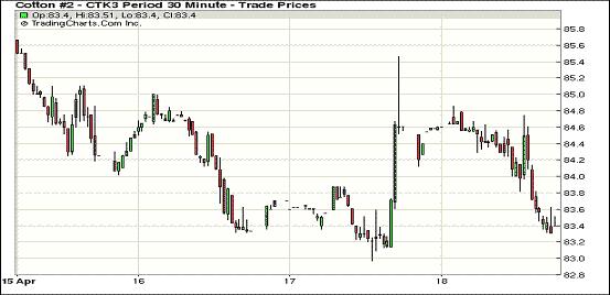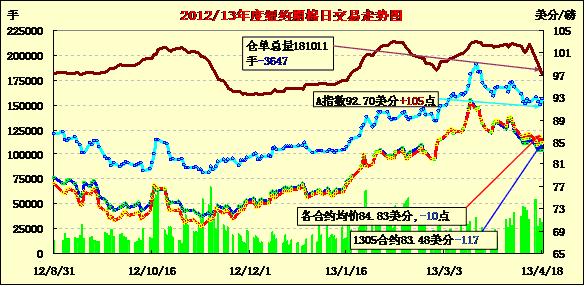 4月18日,中國公布儲備棉投放政策抵消了美棉出口大幅增加的利好作用,紐約期棉結(jié)束前一日的短暫反彈大幅走低,近期5月合約結(jié)算價83.48美分/磅,跌117點;主力7月合約結(jié)算價85.48美分/磅,跌117點;12月合約結(jié)算價85.08美分/磅,跌79點。當日期棉早盤受賣盤打壓走低,午盤前一波買盤低位跟進促市場短暫反彈,隨后中國公布公布新一輪儲備棉投放政策,將組織投放部分2011年度進口棉及2012年臨時收儲的棉花,這打壓期棉在交易后半段下行,主力7月合約盤終收跌百余點,完全抵消了前一交易日的漲幅。當日外部商品市場漲跌互現(xiàn)。據(jù)美國農(nóng)業(yè)部(USDA),4.5-4.11一周美國凈簽約出口陸地棉47899噸(較前一周增44%,較近四周平均值均增53%),裝運89834噸(較前一周增46%,較近四周平均值增27%)。截至4月11日,本年度美棉累計簽約出口達年度預(yù)期量的95%,裝運達71%。