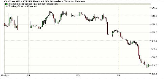4月24日,因近期5月合約進(jìn)入第一交割通知日,投資者繼續(xù)結(jié)清頭寸對(duì)市場形成壓力,同時(shí)經(jīng)濟(jì)憂慮及止損賣盤對(duì)期棉形成打壓,ICE期棉連續(xù)第二個(gè)交易日走低,近期5月合約結(jié)算價(jià)81.10美分/磅,跌158點(diǎn);主力7月合約收于82.95美分/磅,跌215點(diǎn);遠(yuǎn)期12月合約結(jié)算價(jià)83.42美分/磅,跌199點(diǎn)。市場成交量有所回升。當(dāng)日期棉平穩(wěn)開盤,投資者在5月合約期滿前繼續(xù)結(jié)清頭寸打壓市場一路下行,主力7月合約盤中跌破84美分支撐位,觸動(dòng)止損賣盤進(jìn)一步加劇跌幅,當(dāng)日最低至82.84美分/磅。該合約在4月份的前18個(gè)交易日中有12日走低,當(dāng)日收于2月26日以來最低點(diǎn)。近月5月合約下滑1.58美分,或1.9%,從3月15日觸及的93.93美分的高位累計(jì)下跌逾13%。