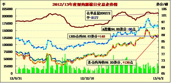 4月2日,市場(chǎng)對(duì)中國(guó)以外的棉花供需情況產(chǎn)生擔(dān)憂,同時(shí)美元走低、美股及外部商品市場(chǎng)多數(shù)上揚(yáng),紐約期棉全面反彈,近期5月合約結(jié)算價(jià)88.87美分/磅,漲148點(diǎn);7月合約結(jié)算價(jià)90.34美分/磅,漲150點(diǎn);12月合約結(jié)算價(jià)87.54美分/磅,漲61點(diǎn)。市場(chǎng)成交量較前幾日也有所放大。當(dāng)日市場(chǎng)平穩(wěn)開(kāi)盤(pán),近期5月合約早盤(pán)在87-88美分區(qū)間震蕩。后國(guó)際棉花咨詢委員會(huì)(ICAC)報(bào)告公布使市場(chǎng)對(duì)中國(guó)之外的供需情況產(chǎn)生擔(dān)憂,期棉強(qiáng)勁反彈。經(jīng)濟(jì)方面,塞浦路斯在實(shí)現(xiàn)預(yù)算方面獲得更多時(shí)間,歐元區(qū)制造業(yè)活動(dòng)數(shù)據(jù)也好于預(yù)期,美元走低、美股及商品市場(chǎng)普遍上揚(yáng),期棉也受到支持。當(dāng)日該合約基本在前一日的震蕩區(qū)間內(nèi)運(yùn)行,盤(pán)終大幅收漲抵消了前一日的跌幅;其他合約也普遍上揚(yáng)。