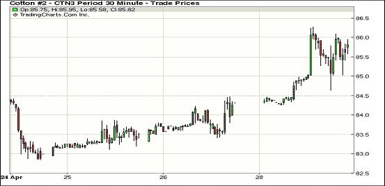 4月29日,紐約期棉市場多數(shù)合約漲幅過百點,主力7月合約結(jié)算價85.74美分/磅,漲149點,12月合約84.70美分,漲112點。外圍谷物市場整體收漲,期棉獲益。7月合約開盤穩(wěn)于84美分以上,早盤突破85美分后獲得向上動能,投機商買盤促其一舉突破86美分,在挑戰(zhàn)86.5美分失敗后盤中在85-86美分區(qū)間波動,最終收于該區(qū)間內(nèi)。美元指數(shù)下跌及基本面有消息支撐,大豆、玉米和小麥大漲,期棉獲得支持。分析指出,雖然外圍市場促進期棉收高,但市場短期內(nèi)上行壓力較大,是否延續(xù)漲勢需要從技術(shù)面獲得更多確認。