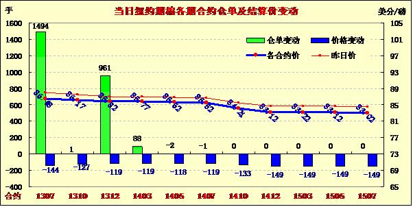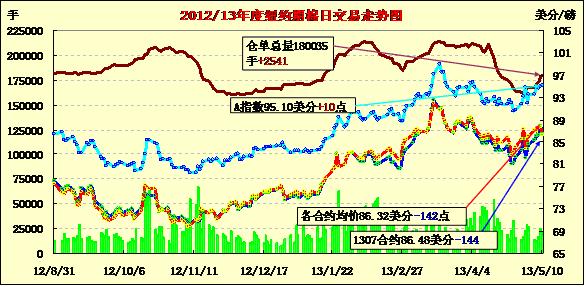 5月10日,在USDA5月份全球棉花供需預(yù)測報(bào)告利空及美元走高、外部商品市場整體走低的打壓下,紐約期棉全面下挫,主力7月合約收于86.48美分/磅,跌144點(diǎn);遠(yuǎn)期12月合約結(jié)算價(jià)85.52美分/磅,跌119點(diǎn)。當(dāng)日市場低開低走,主力7月合約早盤在87.5美分/磅一線震蕩,后USDA報(bào)告利空打壓市場在下半場急速下跌,同時(shí)受外部市場普跌拖累,該合約收于當(dāng)周最低點(diǎn)。但市場當(dāng)周整體走高,7月合約累計(jì)漲2點(diǎn),12月合約漲91點(diǎn)。美國農(nóng)業(yè)部(USDA)在昨日發(fā)布的5月份全球棉花工序預(yù)測報(bào)告中,首次公布了對2013/14年度的預(yù)測,預(yù)計(jì)下年度全球棉花總產(chǎn)2565萬噸,較本年度減68萬;消費(fèi)2404萬增50萬;期末庫存2019萬增173萬,庫存消費(fèi)比增加至84%,這對棉花市場形成壓力。